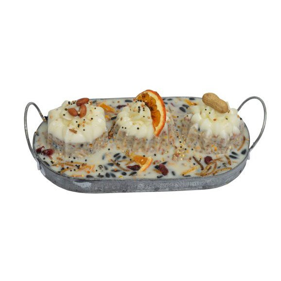 Breng leven en gezelligheid in uw tuin met deze buitenvogeltaart. Het stijlvolle zinken schaaltje is rijkelijk gevuld met fruit, vet en nootjes – precies wat tuinvogels nodig hebben om energie op te doen. Zet de taart op de buitentafel en u ziet hoe meesjes, mussen en merels dankbaar neerstrijken om van dit feestmaal te genieten.