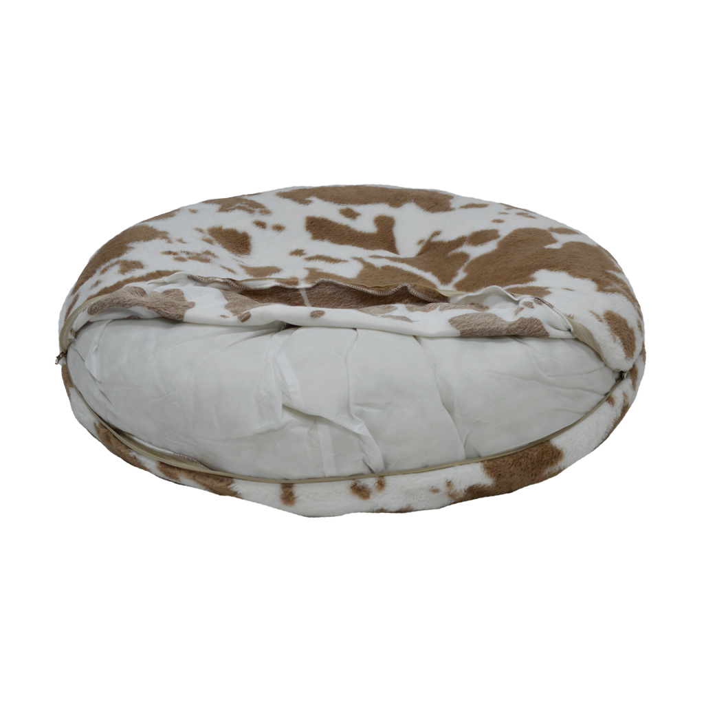 Geef jouw hond een heerlijk knus plekje met een vleugje oer-Hollandse charme: de Sofa Rond Hoog – Hollandse bonte boeren koe print in beige en bruin. Een warme, landelijke uitstraling geïnspireerd op de Hollandse weilanden, waar de zwartbonte koeien rustig grazen en het leven nét even gemoedelijker voelt. 🇳🇱🐄