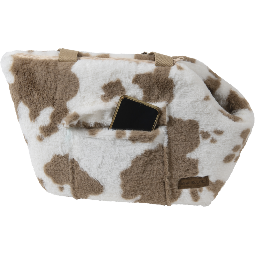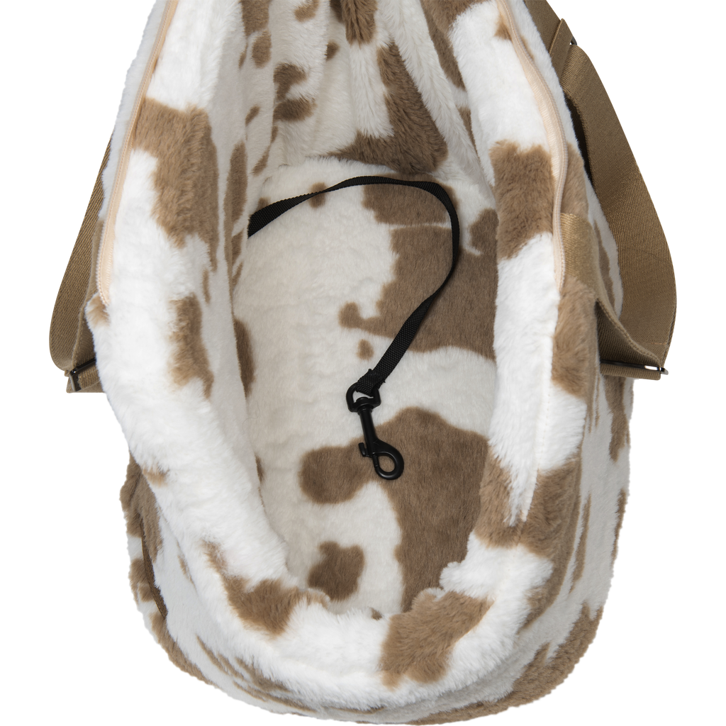 Neem jouw kleine hond of kat overal stijlvol mee naartoe met de Draagtas Hollandse bonte boeren koe print in warm beige en bruin. Een tas met een knipoog naar het oer-Hollandse platteland – waar de koeien in de wei staan en gezelligheid centraal staat. đŸ‡ŗđŸ‡ąđŸ„