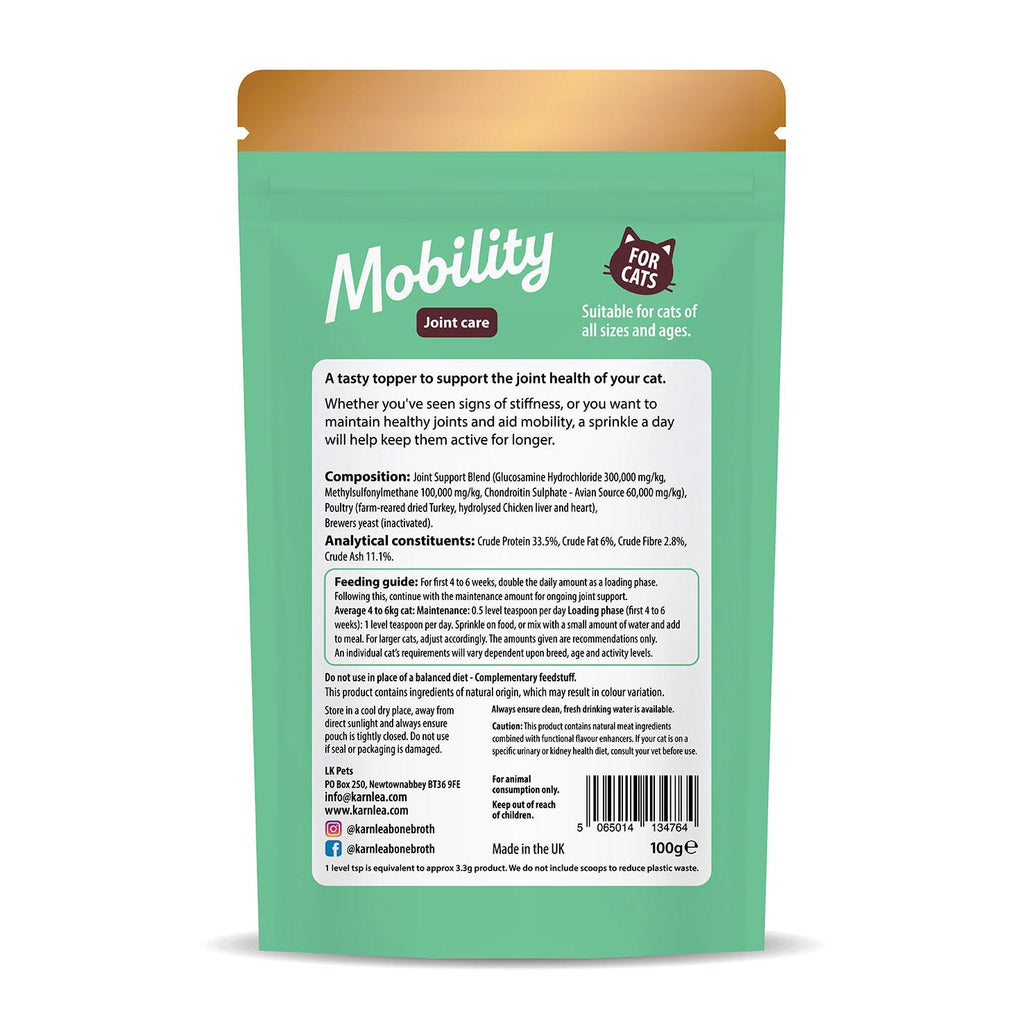 Mobiliteit – Gewrichtsverzorging voor katten – Ons zorgvuldig samengestelde supplement voor gezonde gewrichten en gewrichtsverzorging is een functionele topping boordevol ingrediënten die gezonde gewrichten bevordert. Of het nu gaat om stijfheid, het behoud van gezonde gewrichten en het bevorderen van mobiliteit, zodat uw kat langer actief kan blijven. De formule is zeer smakelijk en heeft een intense, verleidelijke geur. Het kan door het voer worden gemengd, als topping worden toegevoegd of met een beetje vloeistof worden gemengd om een jus te maken.