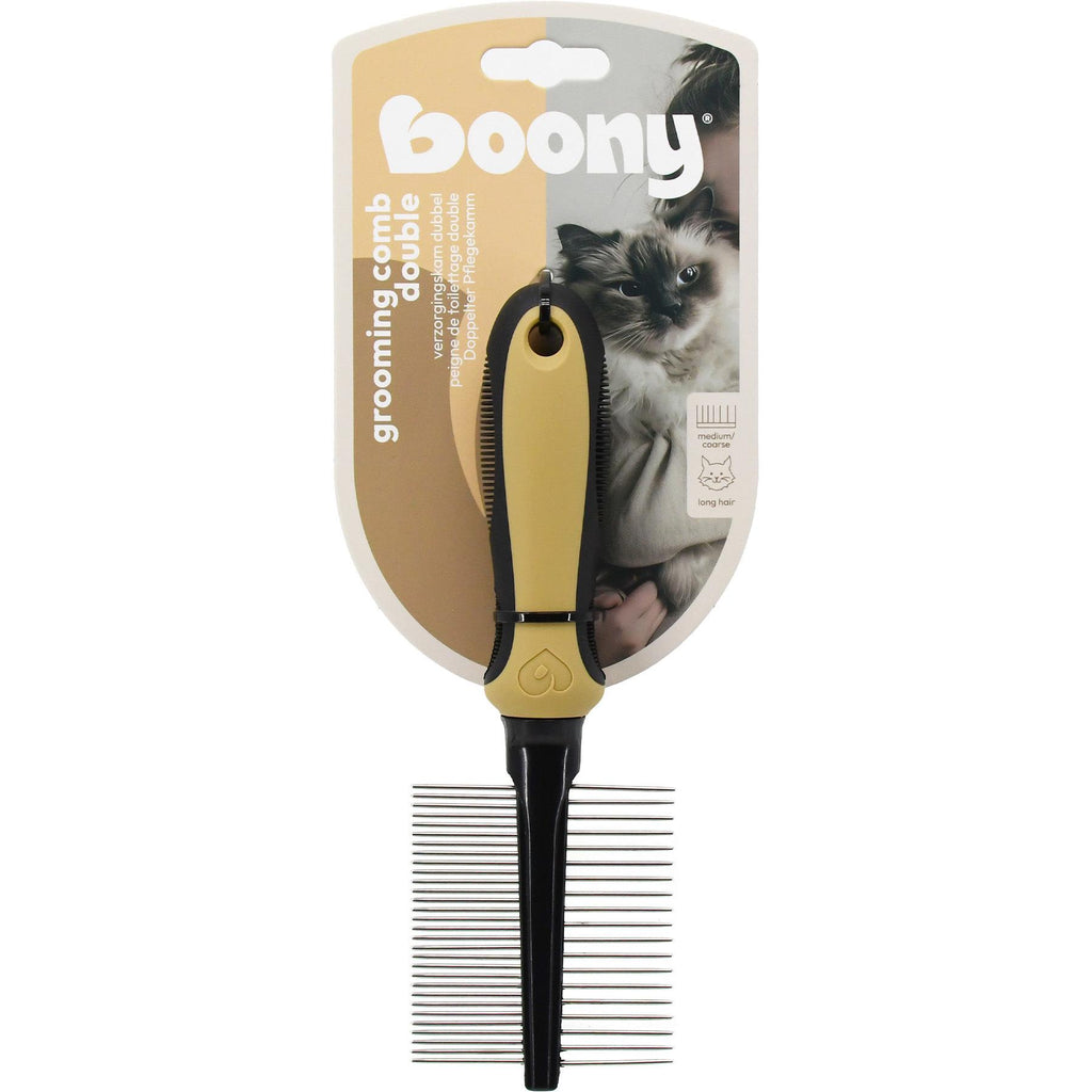 De kam beschikt over twee tandwijdtes, een fijne en een grovere zijde, zodat je gemakkelijk kunt afwisselen tussen ontwarren en glad kammen. Ideaal voor het verzorgen van volle, lange vachten waarbij zowel detailwerk als doorhalen nodig is.