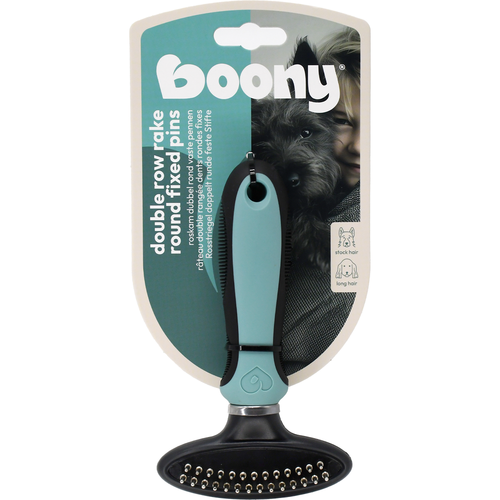 Deze roskam met dubbele vaste pennen is speciaal ontworpen voor honden met stockhaar en lang haar. Dankzij de dubbele rij pennen verwijder je in één beweging meer klitten, losse haren en vuil, wat zorgt voor een grondige en efficiënte verzorging van de vacht. De bovenlaag blijft daarbij netjes intact, terwijl de ondervacht effectief wordt aangepakt.