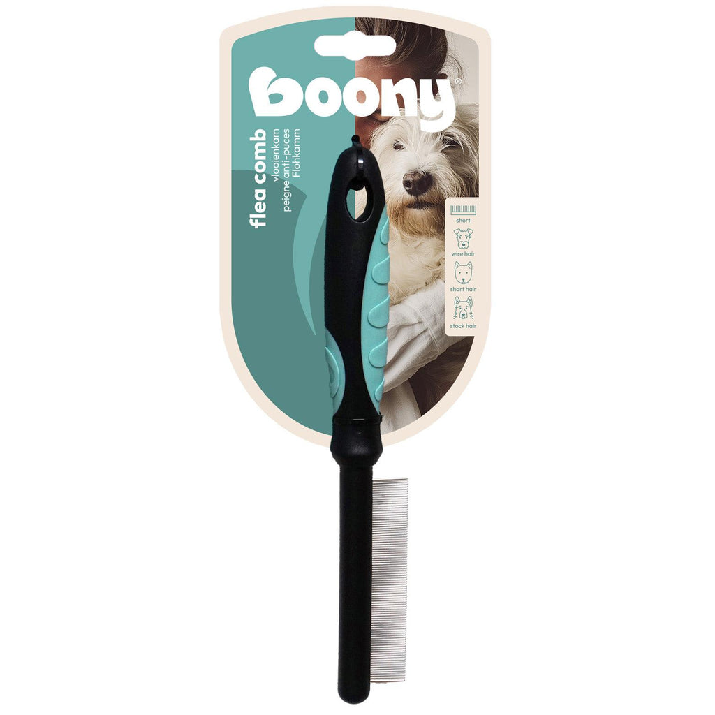 Deze professionele vlooienkam met korte tanden is de ideale keuze voor honden met een korte of ruwe vacht. De fijne, stevige tanden dringen diep genoeg door de vacht om vlooien, eitjes en vuil efficiënt te verwijderen, zonder de gevoelige huid van uw hond te irriteren.